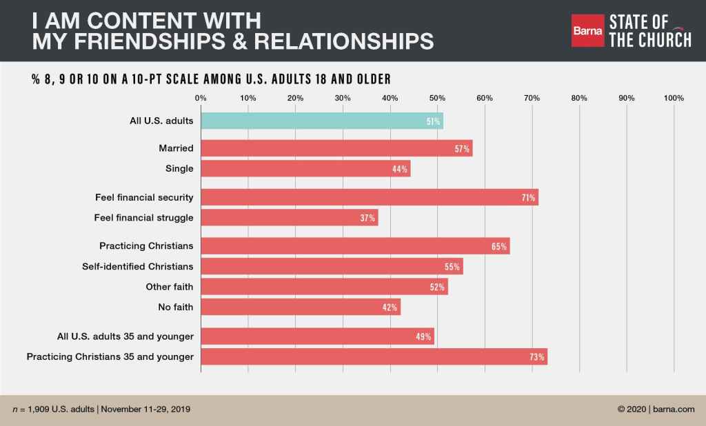 Regardless of marital status, practicing Christians (65%) are far more likely than U.S. adults overall (51%) to express being content with their relationships. Religious faith in general seems to benefit relational contentment (55% self-identified Christians, 52% other faith vs. 42% no faith), but Christian practice makes a notable impact. Again, this is especially true for young adults. Among the general population, 50 percent of Millennials and Gen Z (combined) agree they are relationally content; among practicing Christians, three-quarters of adults 35 and younger (72%) say they are content with their relationships.