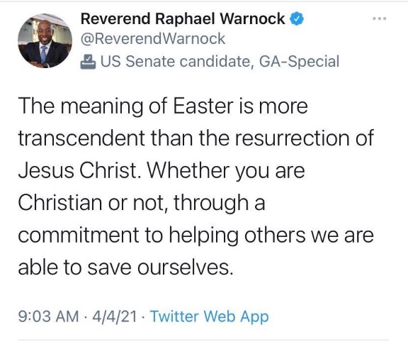 The recently elected Senator from Georgia has been hailed by some as a long-awaited Christian presence in the U.S. Senate. He makes political hay of his ordination, his views on the tyrant Fidel Castro are wishy-washy at best, and openly supports full access to abortion, including partial birth abortion. These behaviors immediately disqualify him as a Christian pastor, but I am currently interested in a tweet he sent out on the Saturday before Easter (which he has since deleted).