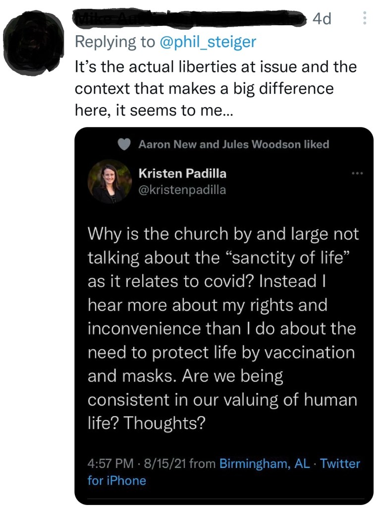 My second response will need to be shorter than it deserves –the medical and scientific case against making most people get the current vaccines is growing and compelling. Even if you are not aware of them, there are scientific cases against vaccine mandates for COVID. Therefore, we cannot assume that vaccines (or masks) are the “pro-life” choice. In fact, if some of the data continue to play out as they are right now, the anti-vax position (in this case given these vaccines) may be a better contender for the pro-life position.